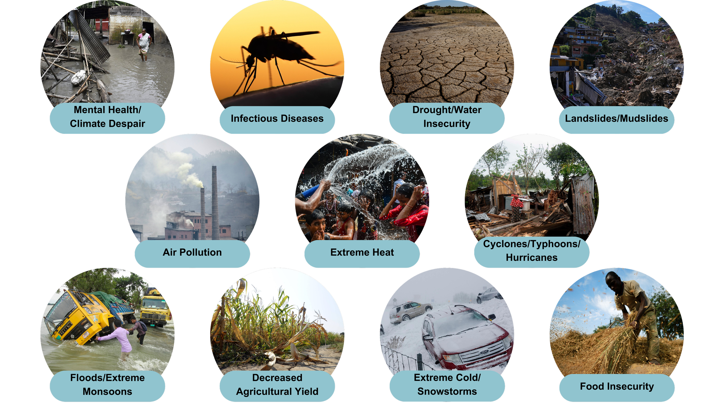 We recognize that climate change is inextricably tied to the health of human societies, and work to bring this connection to the forefront. We tackle 11 of the most prominent health threats posed by climate change, many of which are often overlooked in discussions of climate adaptation.